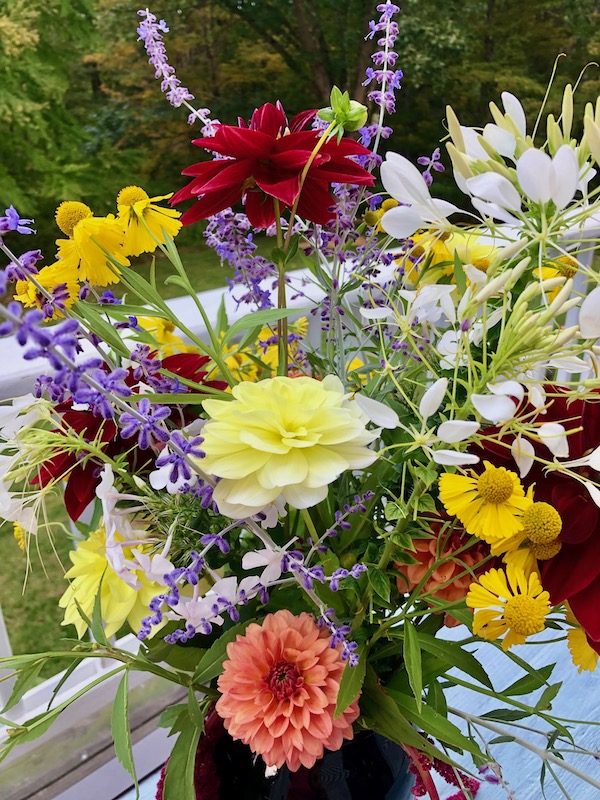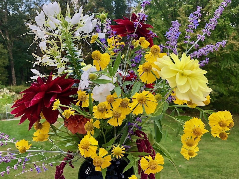 Golden sneezeweed (Helenium autumale), looking like floppy sun hats, add a bit of fun. White garden phlox (P. paniculata) and dancing spider flowers (Cleome hassleriana), along with sprays of purple Russian sage (Perovskia atriplicifolia, syn. Salvia yangii) add a celebratory finish to the arrangement. Too bad I didn’t have party hat props for Cathy!