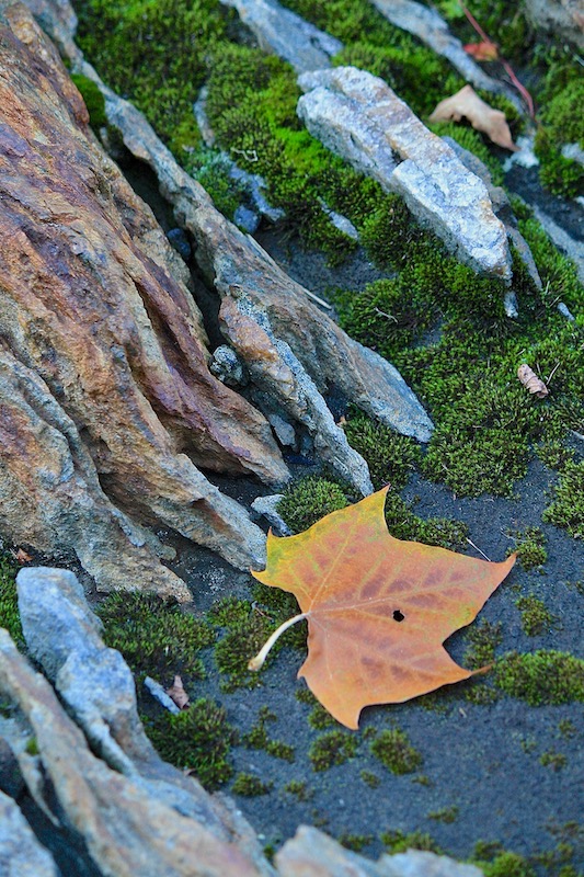 Beautiful capture, Eliza! The rock pointing to the lone autumnal leaf on the bed of green and grey is sublime!