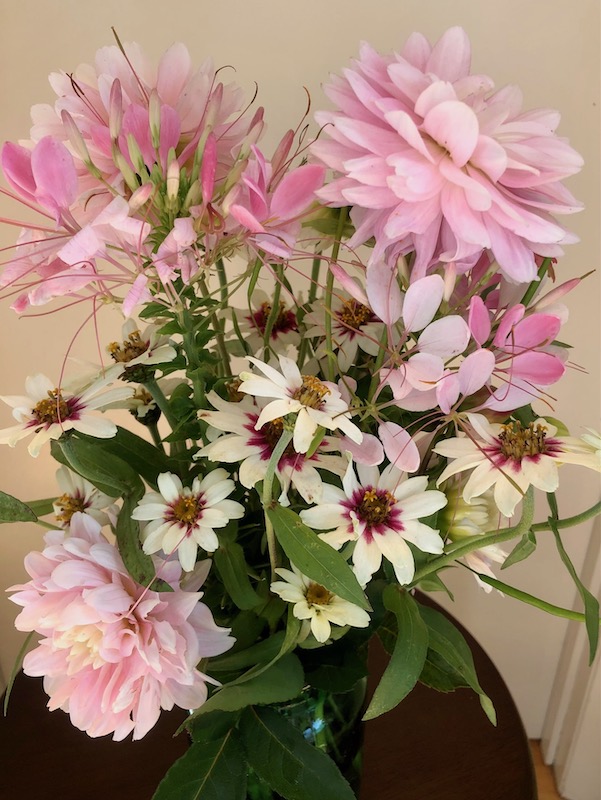 My second vase has pink Dahlia ‘Chilson’s Pride’, spider flower (Cleome hassleriana), and Zinnia angustifolia ‘Profusion Cherry Bicolor’.