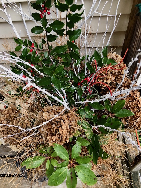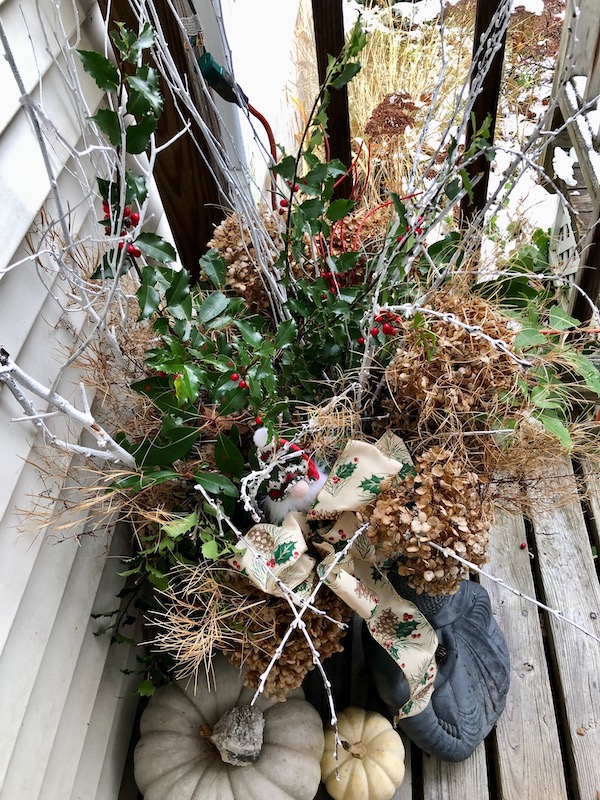 A beautiful way to take these “ingredients” and repurpose them into a warm, welcoming Holiday sight. The white branches are a perfect touch. And, I am sure that gnome is living its best life!