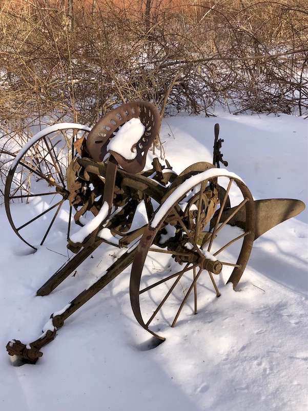 Our property was part of a large dairy farm and there were many horse-drawn implements here and there on the property when we moved in 35 years ago. Only this and a rake are left as a reminder of those days.
