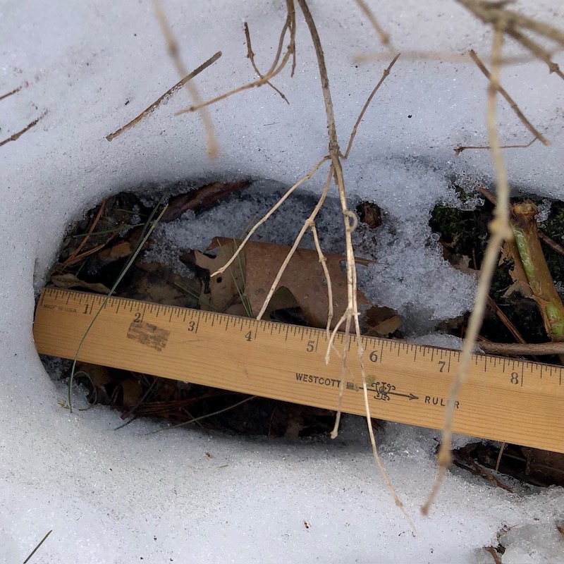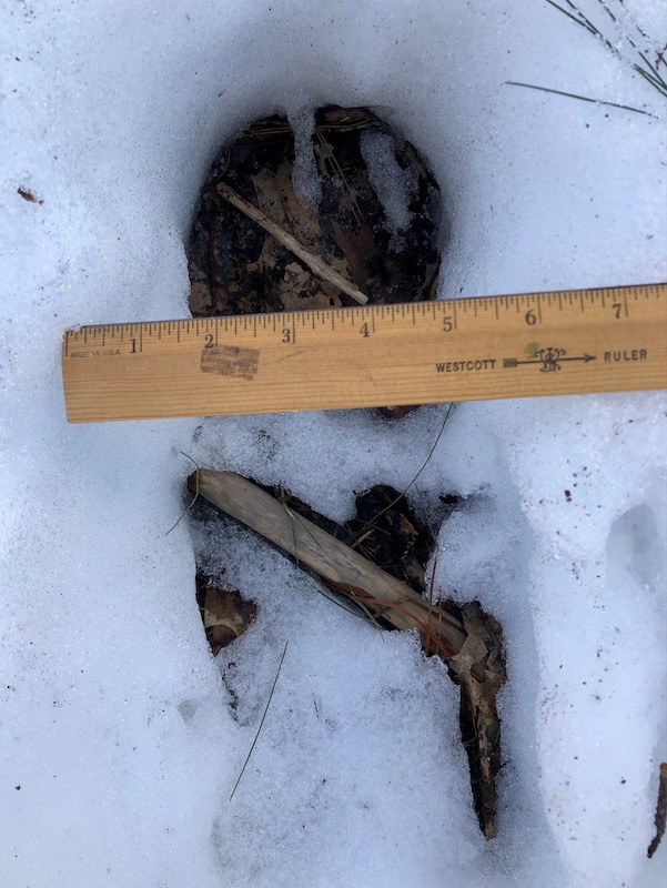 Evidence of a rare visitor in our woods, enabled by six inches of remaining snow.