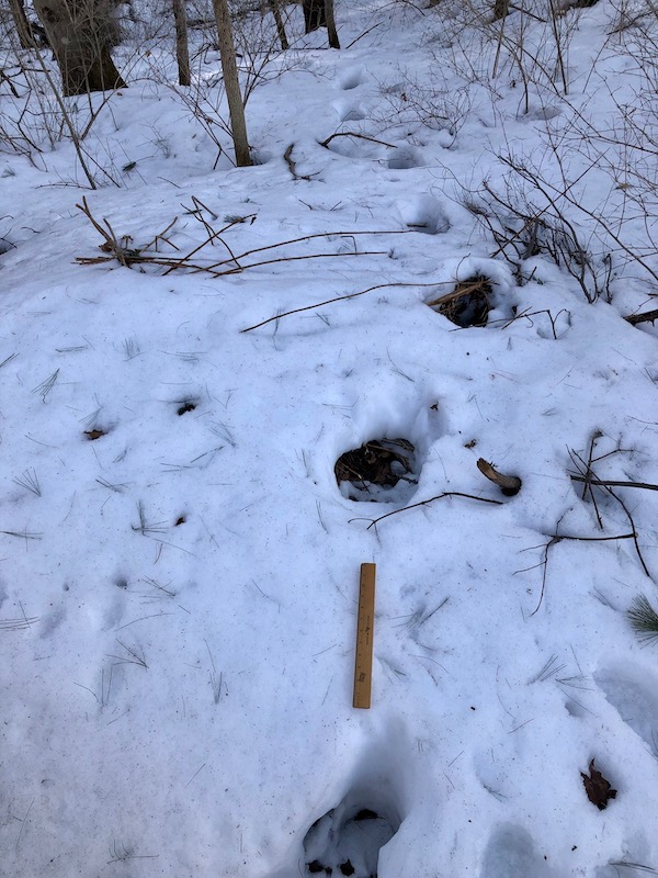Evidence of a rare visitor in our woods, enabled by six inches of remaining snow.