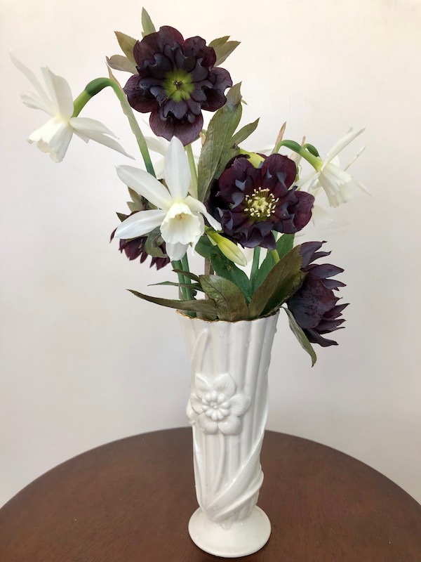 My first vase of the season features Narcissus ‘Thalia’ and a dark purple, semi-double Helleborus hybrid, possibly ‘Wedding Party Dark and Handsome’? in my Lenox daffodil vase. Nice to be back to creating arrangements from my own yard and garden!