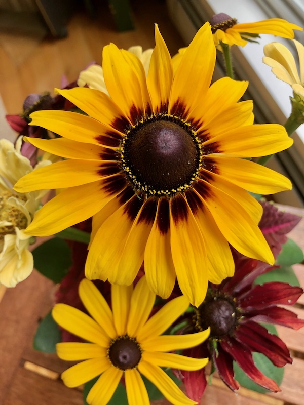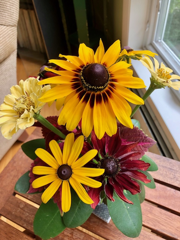 A mix of annual composite flowers are now coming into bloom in my garden. Featured today are a mix of Gloriosa Rudbeckias, including ‘Cherry Brandy’ and some creamy Zinnia elegans. Foliage is Coleus (Plectranthus) and Rhododendron leaves.