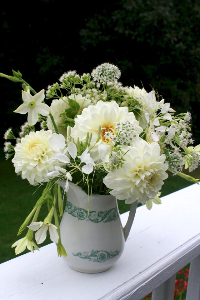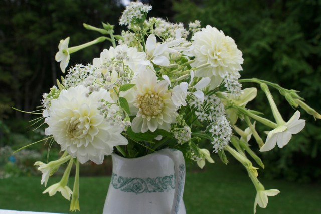 Mid-September and the choices in my garden are growing fewer by the day. Dahlia ‘Lillehammer’ still is putting forth blooms, but like the rest, it loses vigor as summer wanes. Making up the rest of the arrangement are white Flowering Tobacco (Nicotiana alata), pink Zinnias (Z. elegans), the last of the pink phlox (P. paniculata) and cosmos with a handful of Hyacinth Bean (Lablab purpureus) blossoms. Wild Heart-leaved Aster (Symphyotrichum cordifolium) and lime green leaves of Purple Raspberry (Rubus odoratus) are the filler and foliage. Props are a few white pumpkin gourds that once again self-sowed out of the compost, a nice surprise freebie.